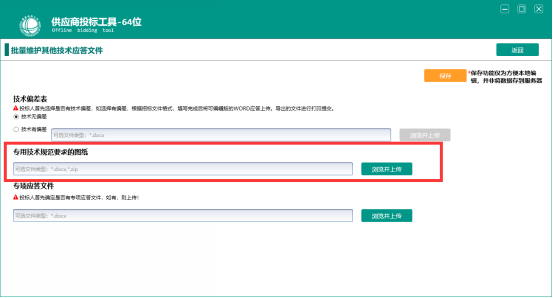 (3)技术文件:按包制作为docx格式,按包批量在按包批量在投标工具-其他技术应答文件-维护其他技术应答文件-专用技术规范要求的图纸端口上传。