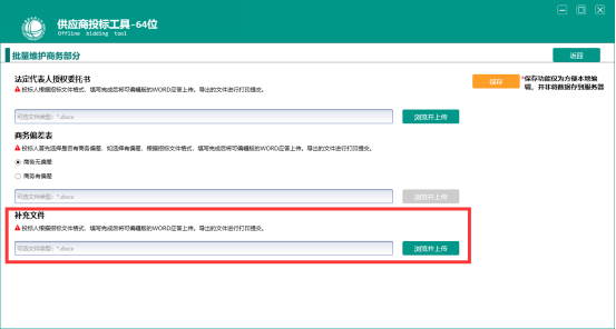 (2)商务文件:按包制作为docx格式,按包批量在投标工具-商务部分-维护商务部分-补充文件端口上传。同一分标的每包文件内容应一致。